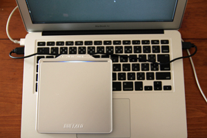 そんなわけで探したところ、3000円弱のバッファローのポータブルDVDドライブDVSM-PC58U2VがMBAでも使えるっぽいので買ってみた。