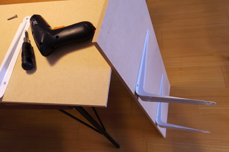 板にもせっせと脚をつける。L字金具に付いてきたネジの長さでは板を突き抜けそうだったので、別に用意した適当な長さのネジをつかって板と固定。今回もIKEAのスクリュードライバが大活躍。1300円くらいでこのパフォーマンスは最高。しかもこの数ヶ月で一度も充電していないのに全然放電していない。
