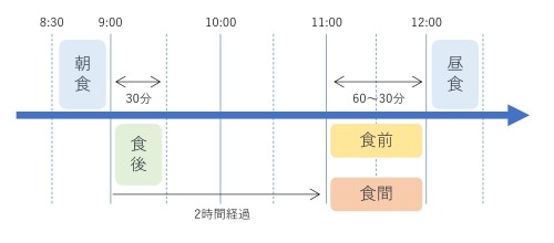 食間:食後2時間以上たって、胃が軽くなってから服用