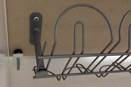 設置する前から薄々気が付いていたけれど、棚用の脚金具が天板を挟み込むタイプで、2点問題がある。1つは天板を後ろから挟み込むわけだから、これまで壁にくっついていた天板が金具分前に出ることになり壁との間に隙間が出来てしまうこと。これは仕方がないことなので諦めるしかない。