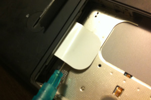 そして深夜の交換作業。バッテリーを外して、メモリ交換のときと同じくL字になってるパーツを精密ドライバーで外す。精密っていうと聞こえはいいけど、うちの場合はただの細いドライバー。ベロを引き抜きハードディスクを引き出す。