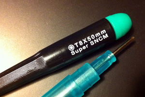 そのベロを新しいのに付け替えるために必要なのが、トルクスドライバー。hpのサーバをマウントとかした経験があれば、先っちょが星形になってる「トルクスドライバー」って知ってるかもしれないけど、まずマイナーだと思う。なんにしても家にはそんなのないので、秋葉館でT8サイズを一緒に買ってきた。このタイミング以外で使うシーンが一生思いつかないけど、ドライバーとかの工具って持ってるとなんか嬉しいから、まーいいか。